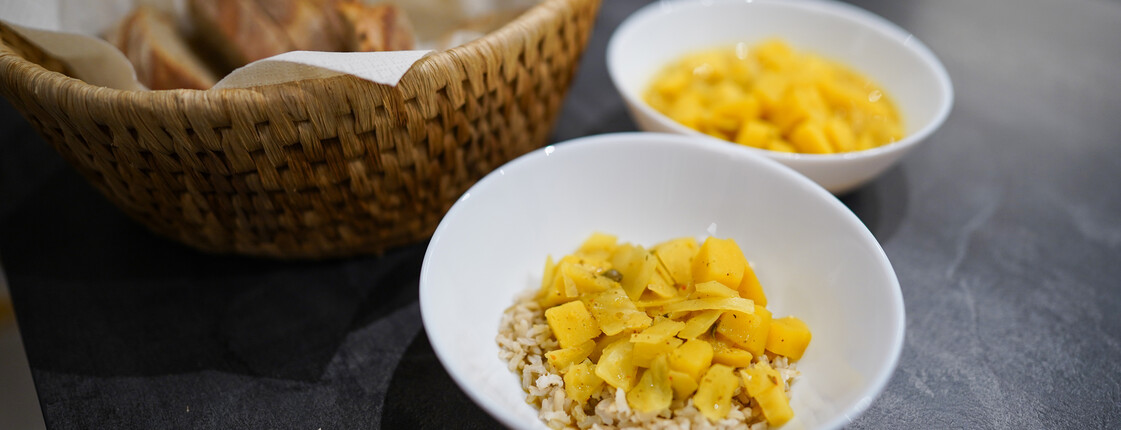 Als Beilage gibt es Reis und Brot. Wir freuen uns auf gesundes Essen und einen frischen Begegnungsort mit guten Gesprächen.